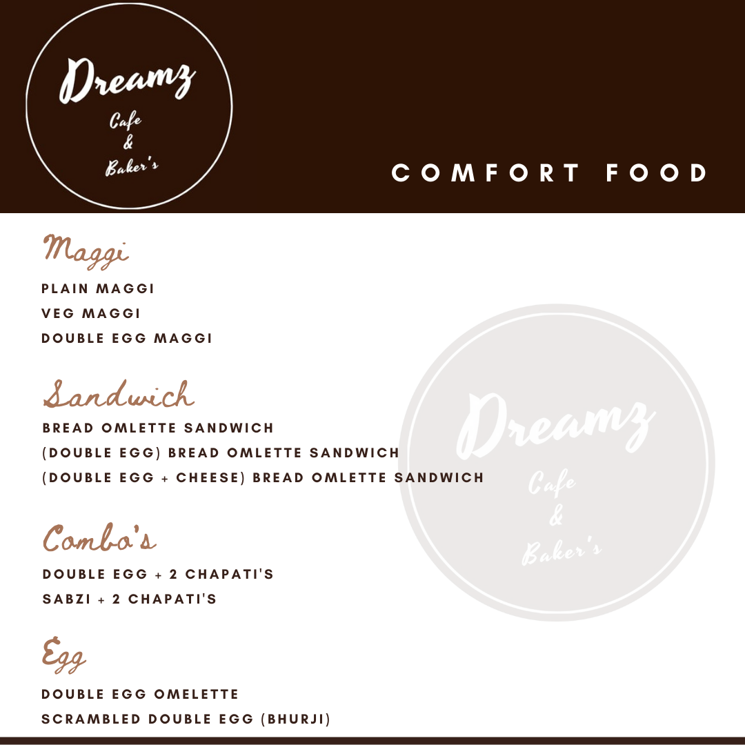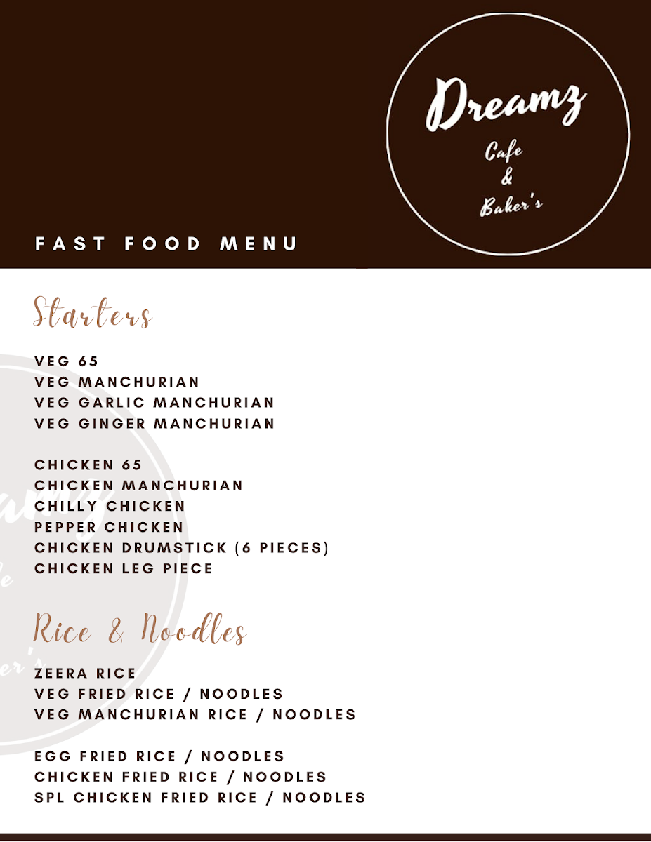 Welcome to Dreamz Cafe & Baker's, a hidden gem located in the heart of Hyderabad, known for its diverse and flavorful menu. Nestled at 786, Bagh Lingampally Rd, the cafe offers an extensive selection that caters to all taste buds. Start your journey with delightful rice and noodles dishes like the Veg Manchurian Rice or Spl Chicken Fried Rice. Savor the essence of Persian cuisine with appetizers like the Persian Olivieh Sandwich and Salad Olivieh, which bring a unique twist to traditional fare.